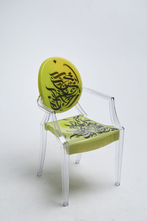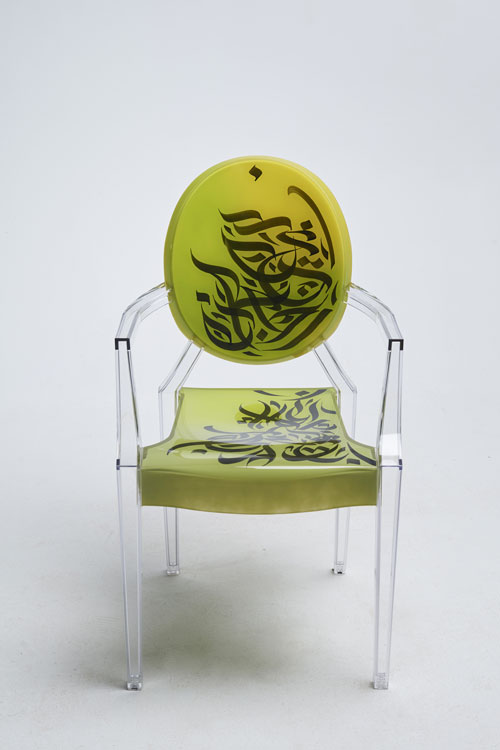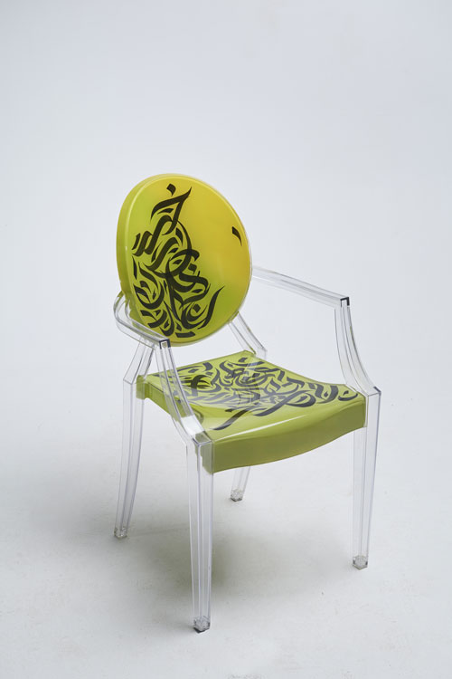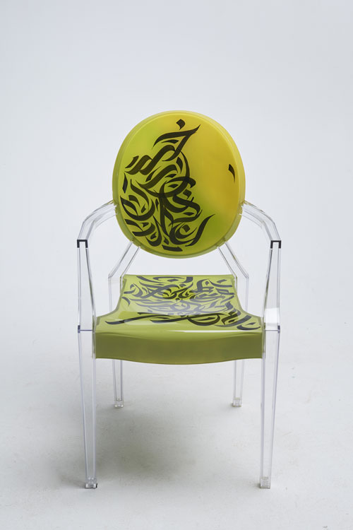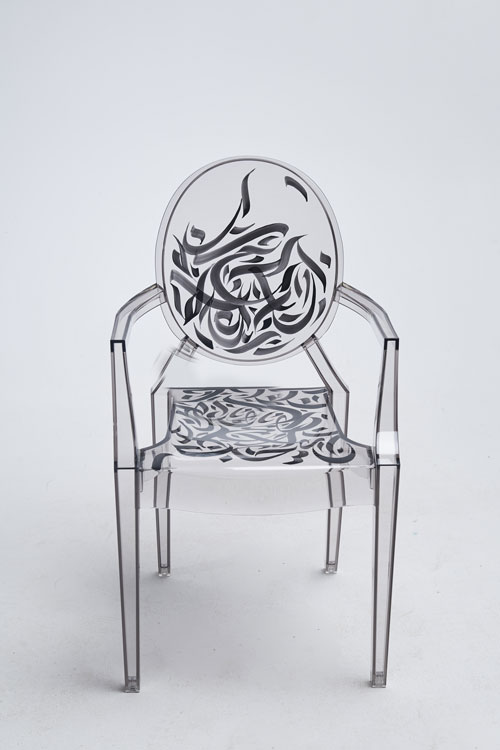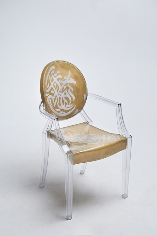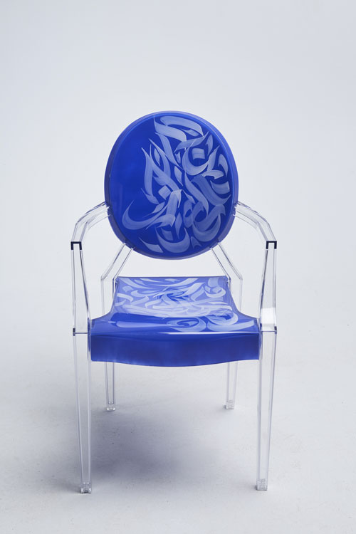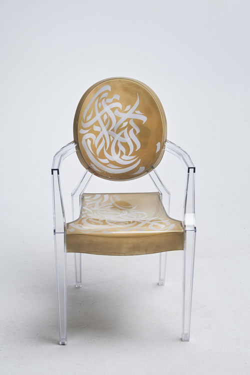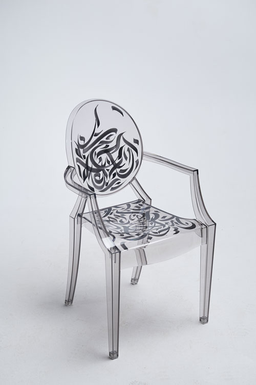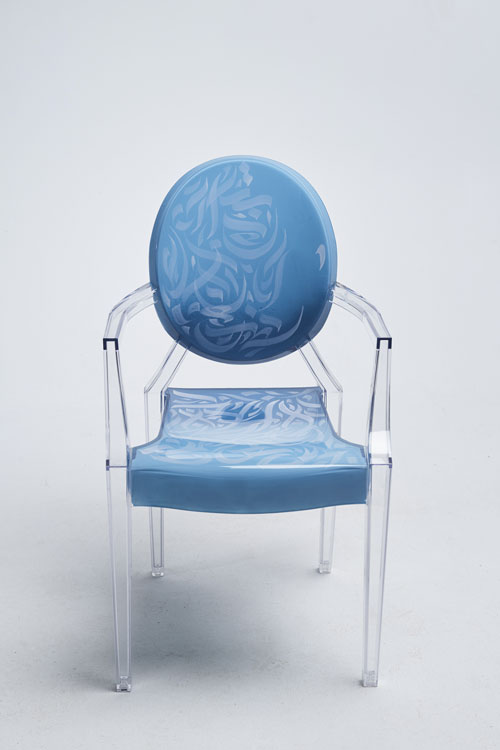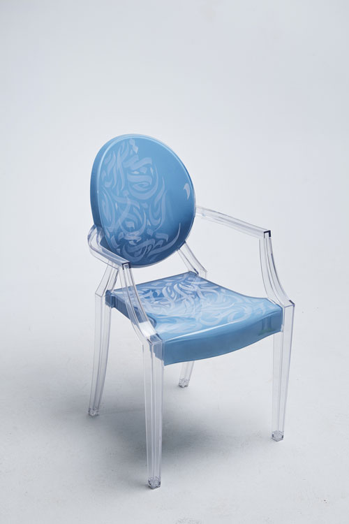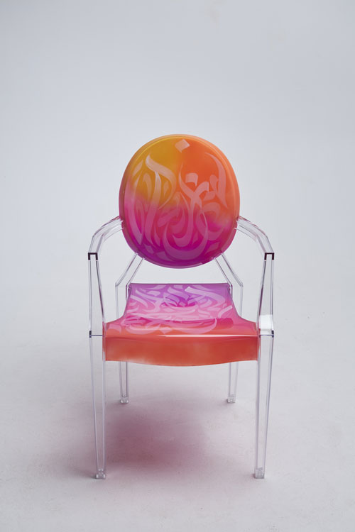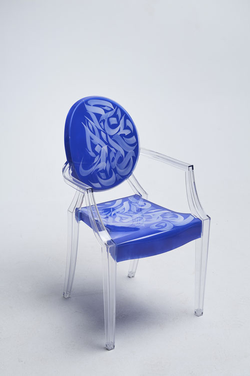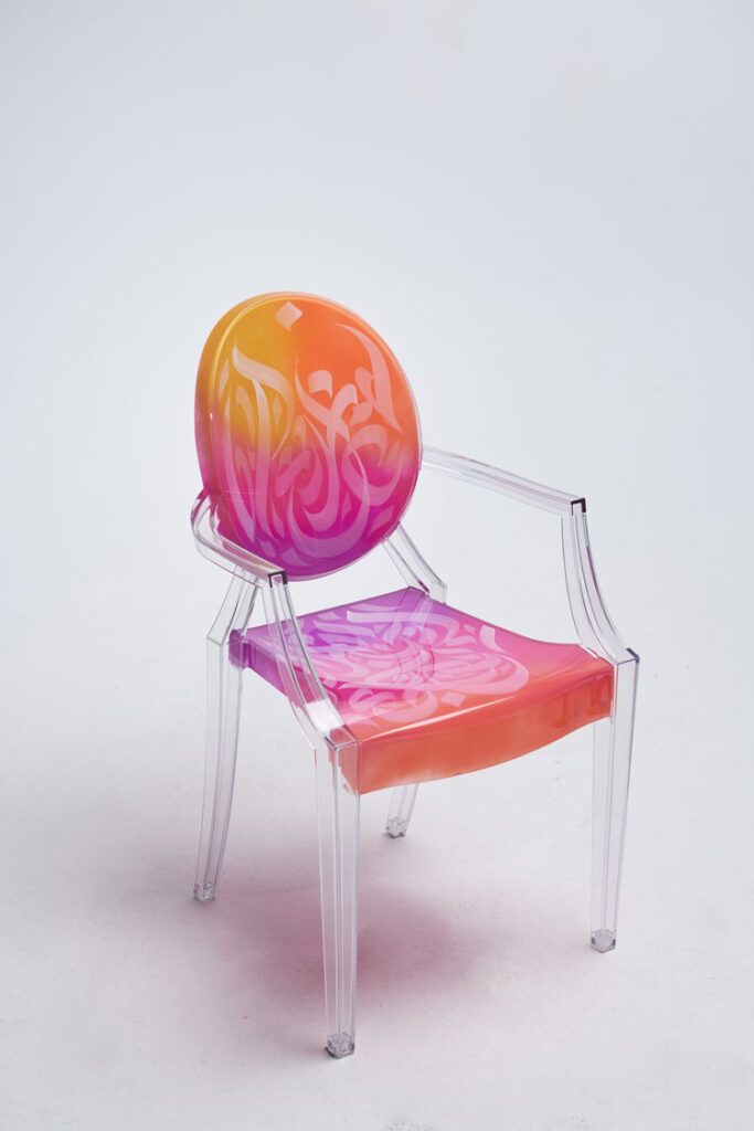Elegant, fluid and artistic! ” These calligraphy lines drawn with precision and skill, creating an impression of movement and grace. The curves of the letters would integrate harmoniously into the structure of the transparent chair, following the contours of the backrest for example, the lines would unfold organically, recalling the features of a brush loaded with ink. It was a challenge for me to write upside down for the first time… but these dynamic letters and abstract compositions create a real functional work of art. My collaboration with Kartell on the Louis Ghost chair created by the designer Philippe Stark, is a creative fusion between the art of contemporary calligraphy and emblematic design, giving birth to a truly unique piece of furniture, rich in visual poetry, imbued with an innovative and captivating artistic expression…